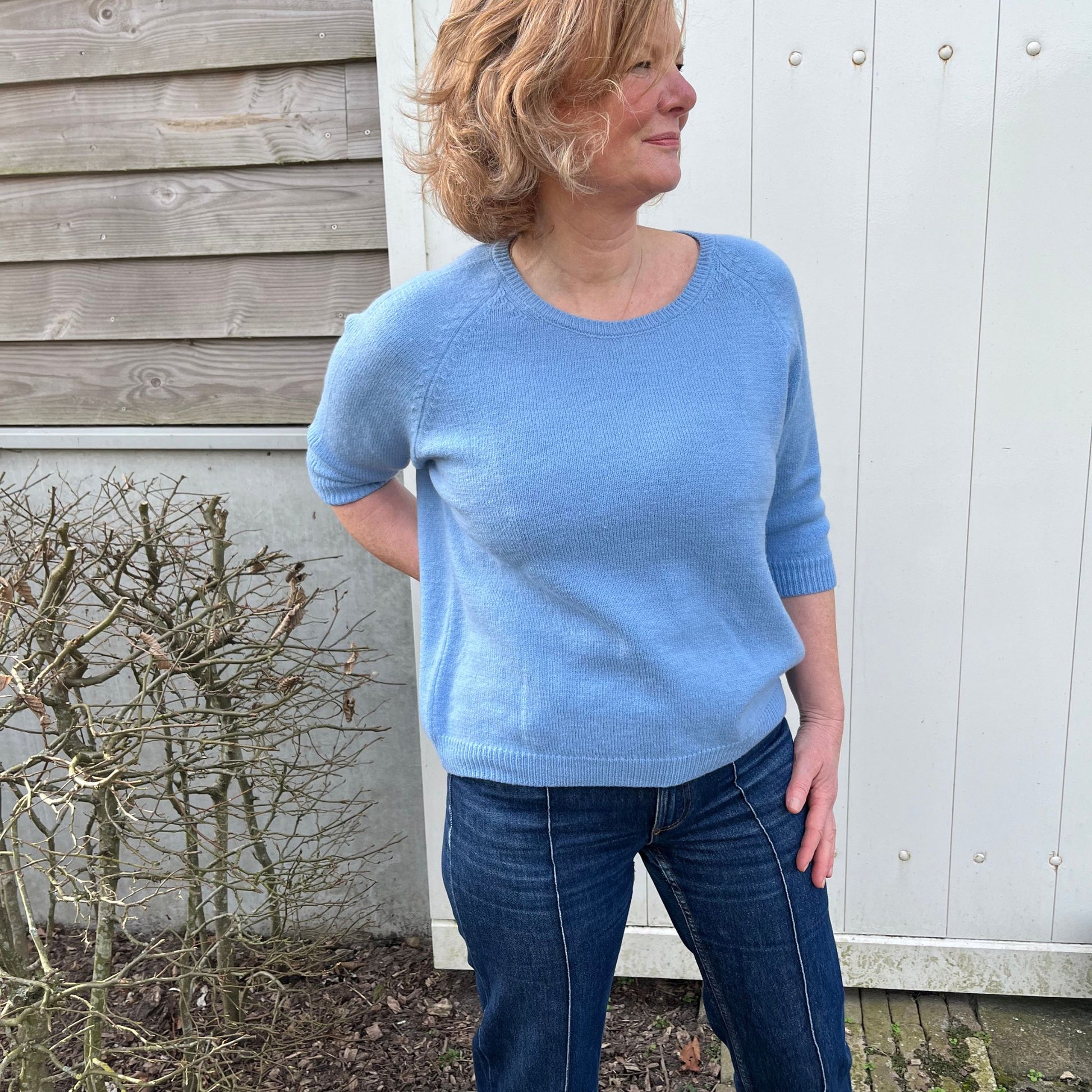 - Raglanmouw, geribd accent in mouw, ronde hals, geribd afgewerkt.